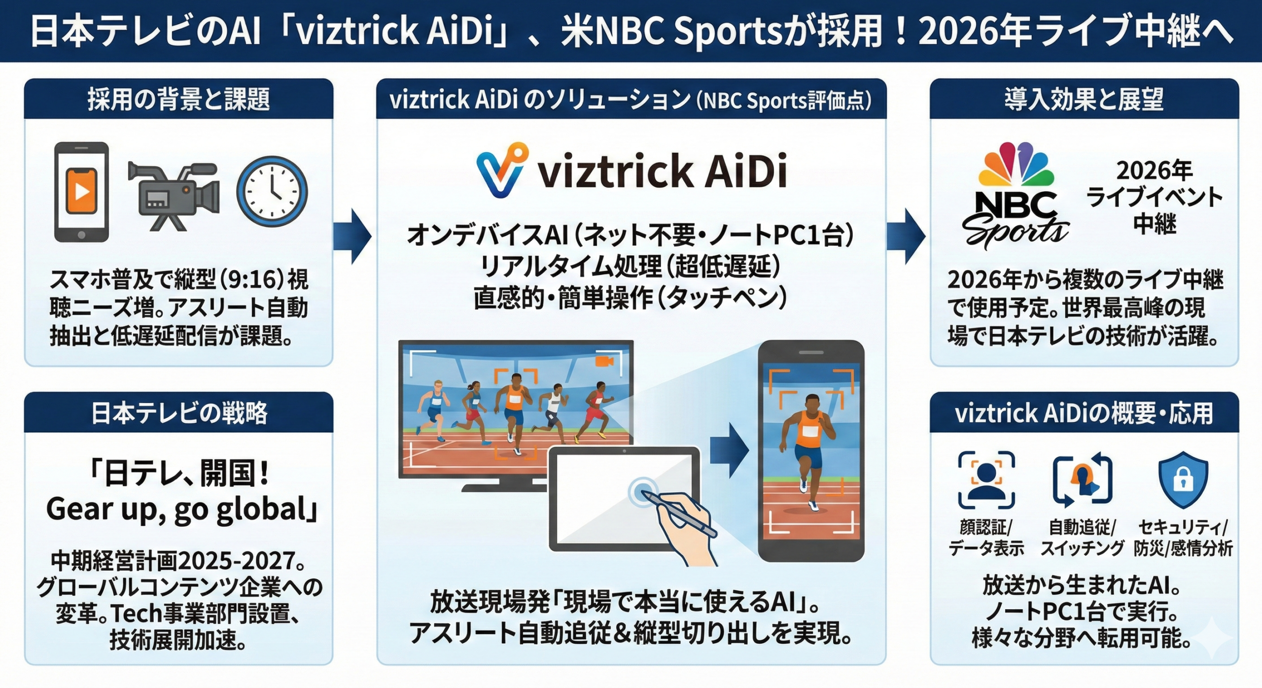 本文 日本テレビが開発したAI技術「viztrick AiDi」が、アメリカの大手放送局NBC Sp […] -