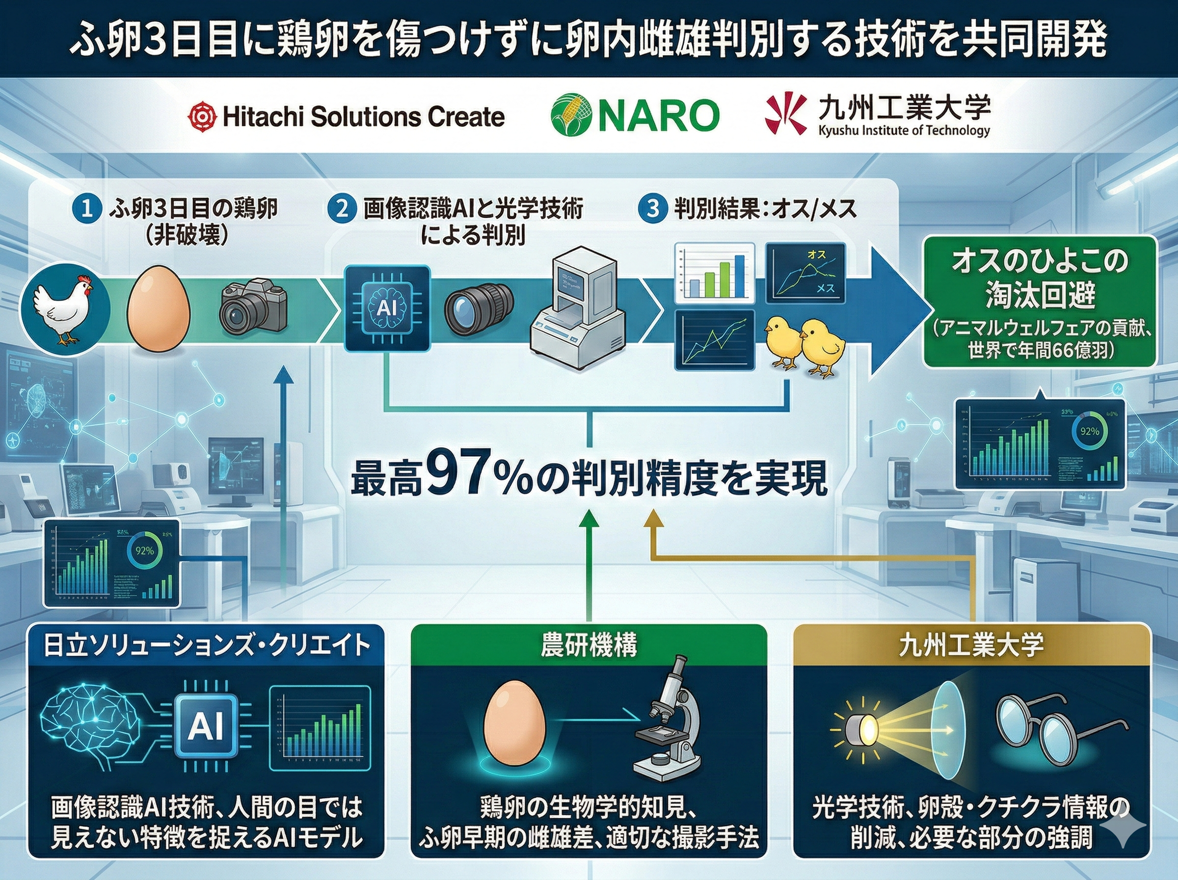 ふ卵3日目に卵を傷つけず雌雄判別、AIで97%の精度を実現——日立ソリューション…
