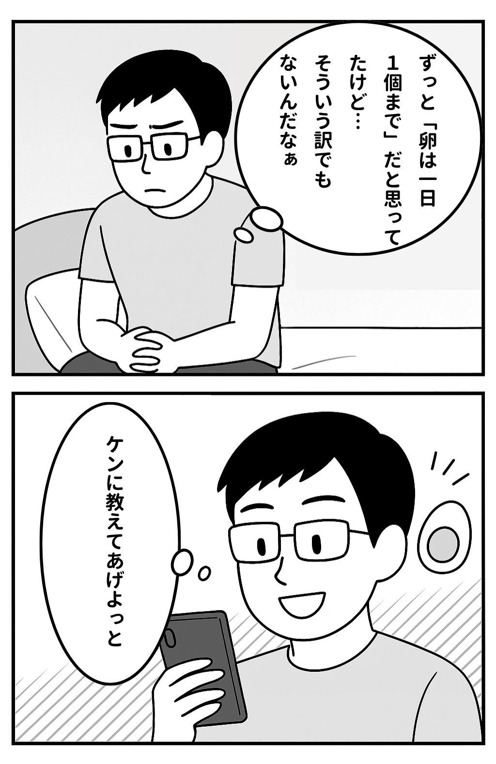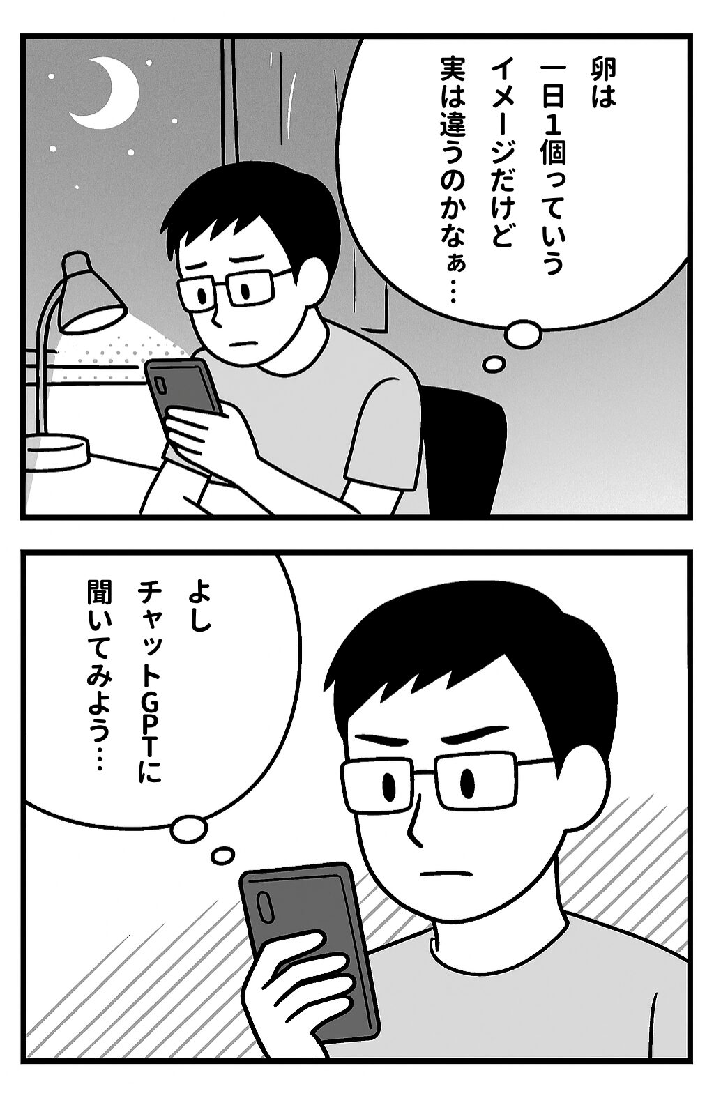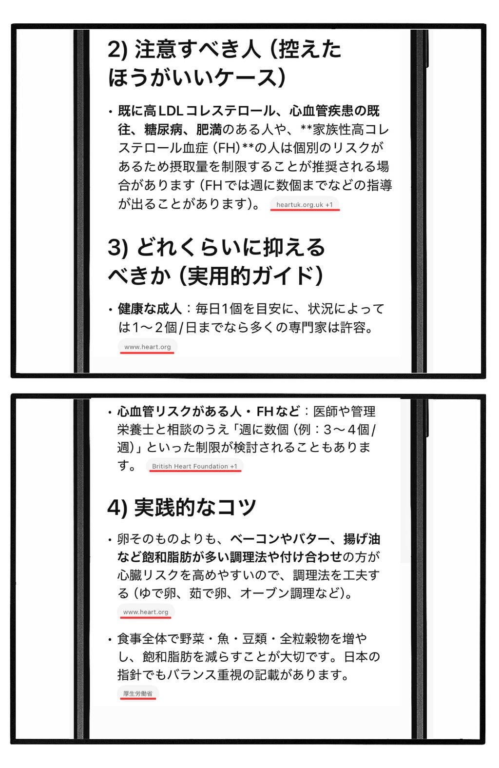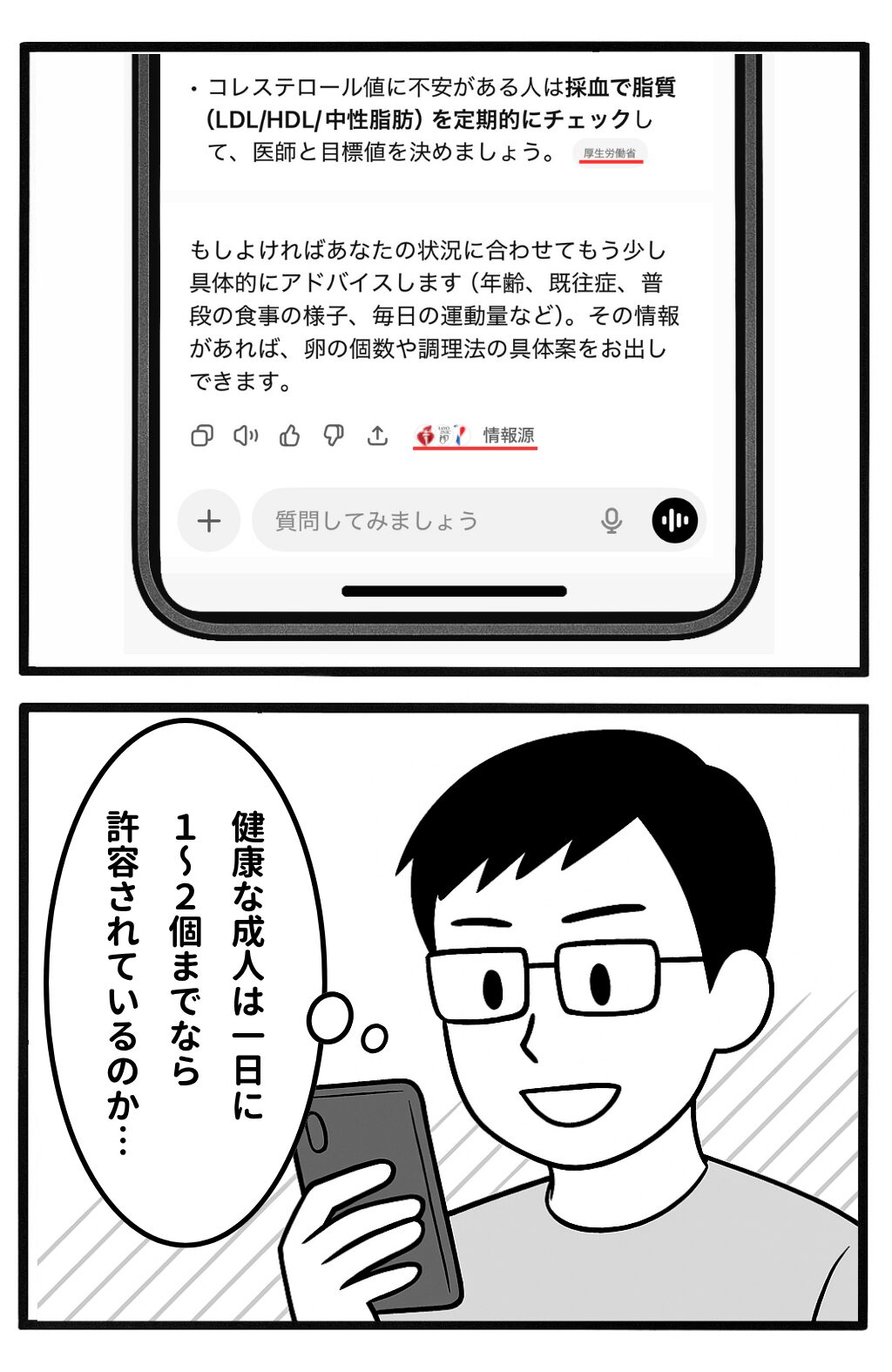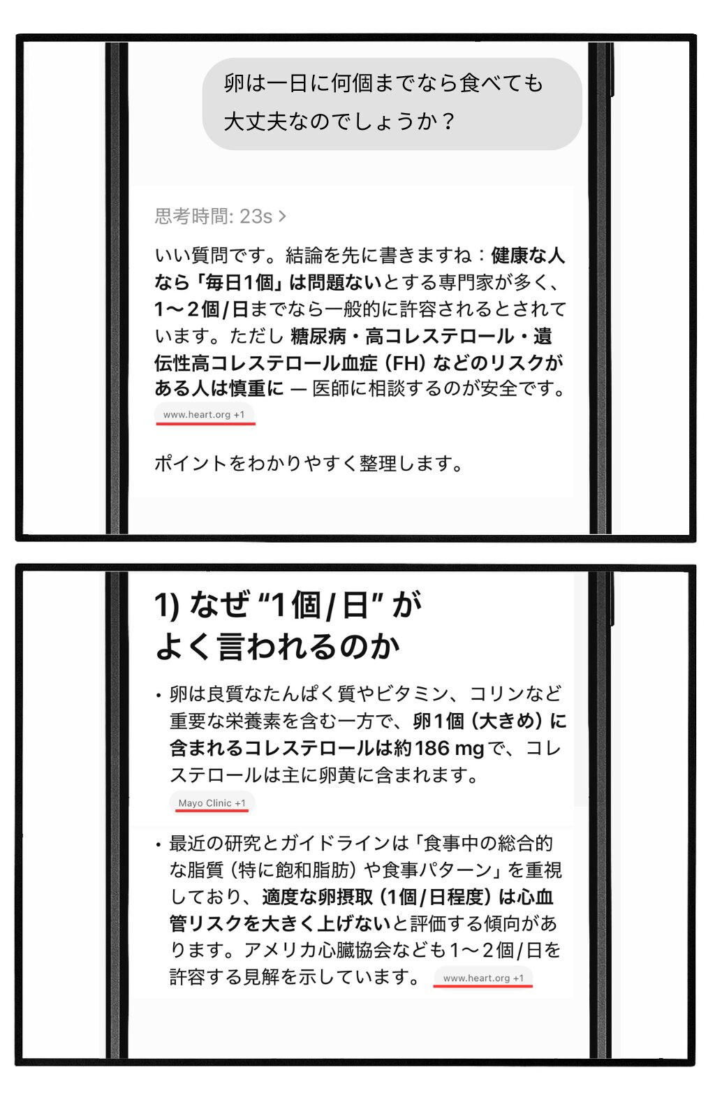 卵って一日一個? 投稿日 2025年10月6日 著者 pr_member02 カテゴリー AI活用漫画 カテゴリー ChatGPT 卵って一日一個? 日常の中でふと浮かぶ素朴な疑問。今回は「卵は一日に何個まで食べても大丈夫なのか?」というテーマをChatGPTに投げかけてみました。 調べる際には、以前ご紹介した「より長く考える機能」を活用しています。この機能を使うことで、ただの短い答えだけでなく、少し丁寧で根拠のある説明を得られるのが魅力です。 また、漫画内の赤い下線で示したように、引用元のサイトURLも確認できるため、自分でさらに詳しく調べたいときにもとても便利です。 AIKnow:Ikeda - シェア - 投稿 - LINE - Pocket