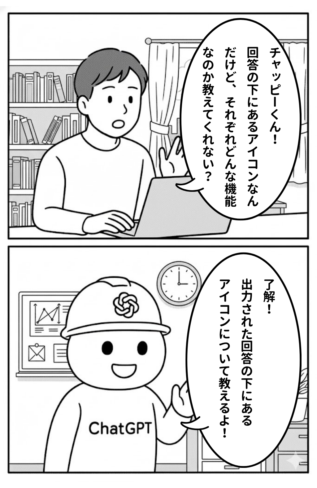 ChatGPTを使っていると、回答の下にいくつかの「アイコン」が並んでいるのを見かけませんか?実はあのアイコンには、便利な機能がたくさん隠れているんです。