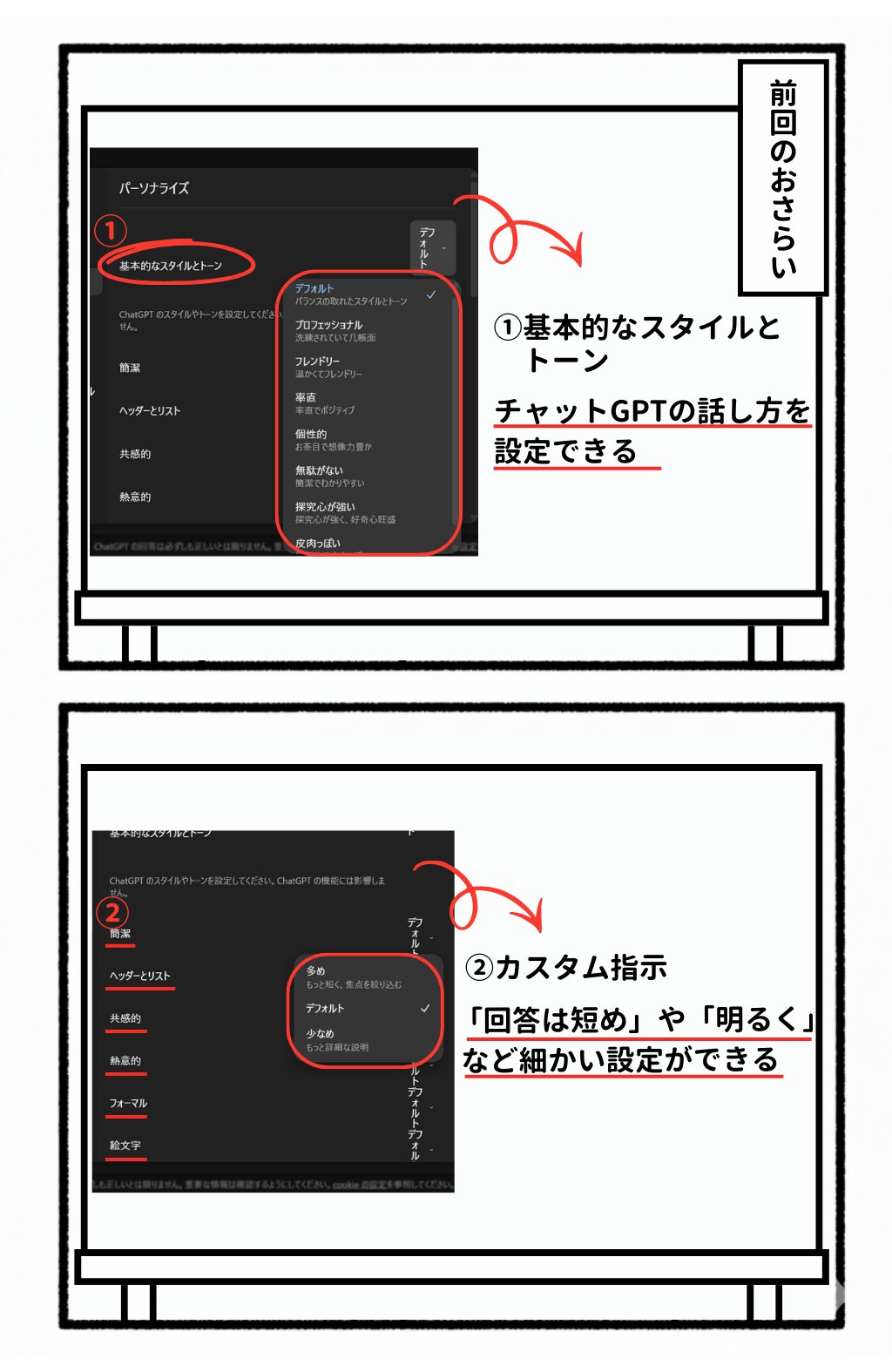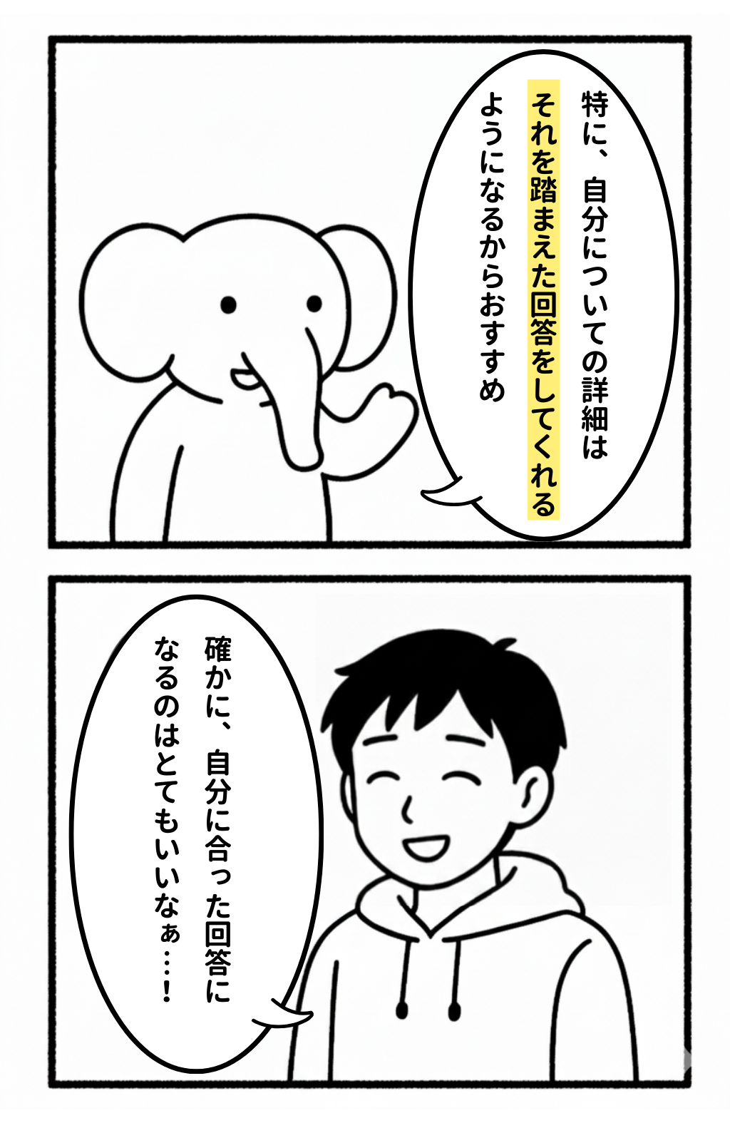 今回の漫画【後半】では、パーソナライズの「あなたについて」と「メモリー」の2つを紹介しています。