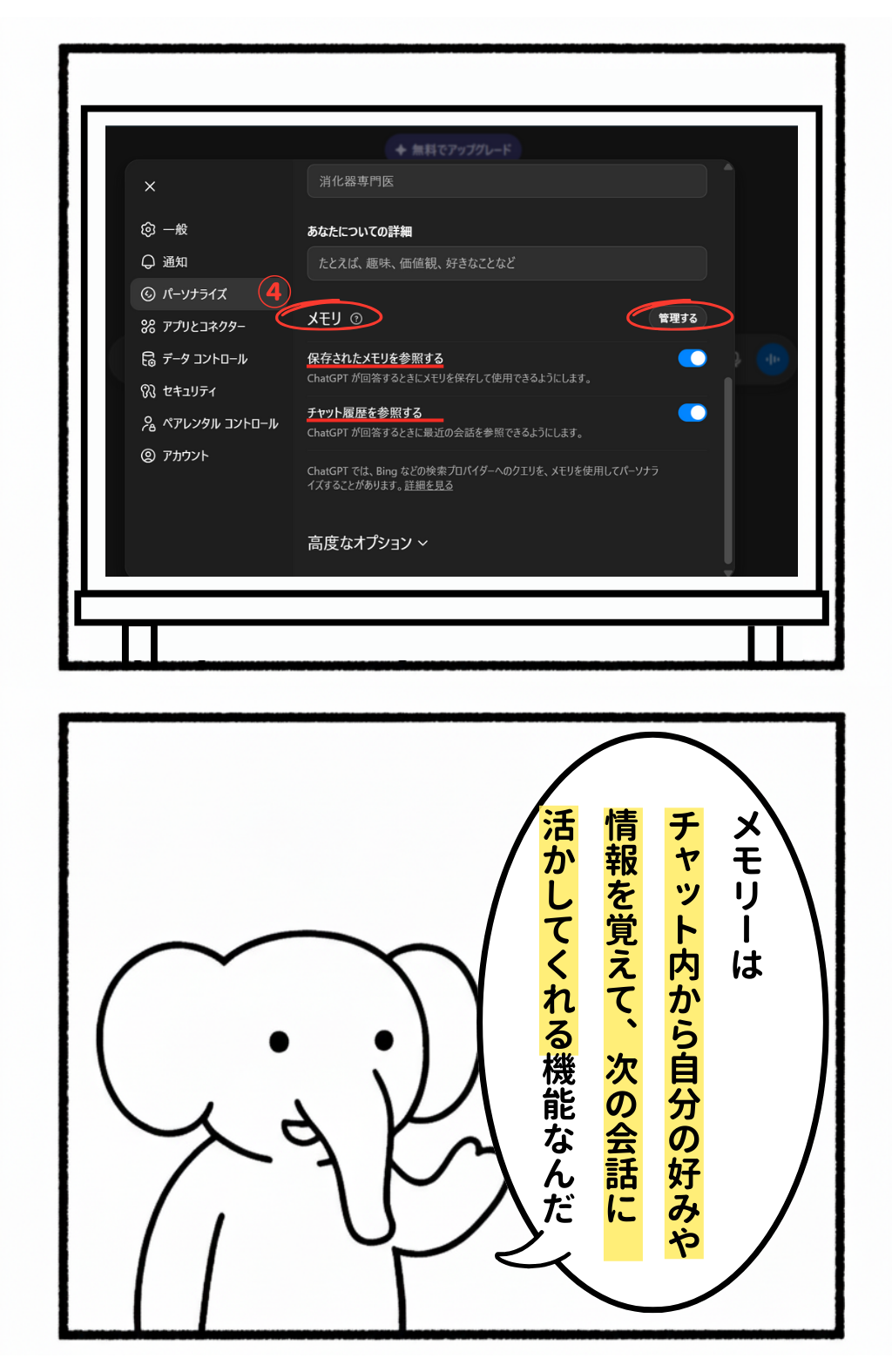 また、ChatGPTが何を記憶しているのか確認したいときは、画面右上のメニューから「メモリー」→ 「管理する」(※5ページの赤丸で示した箇所)を開くことで、保存されている内容を一覧でチェックできます。
