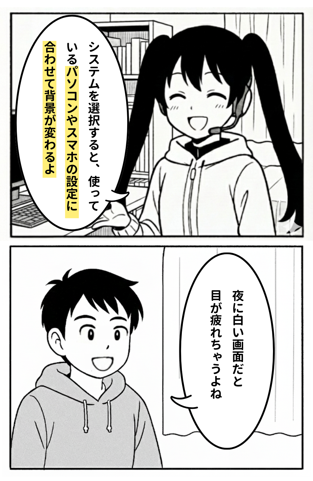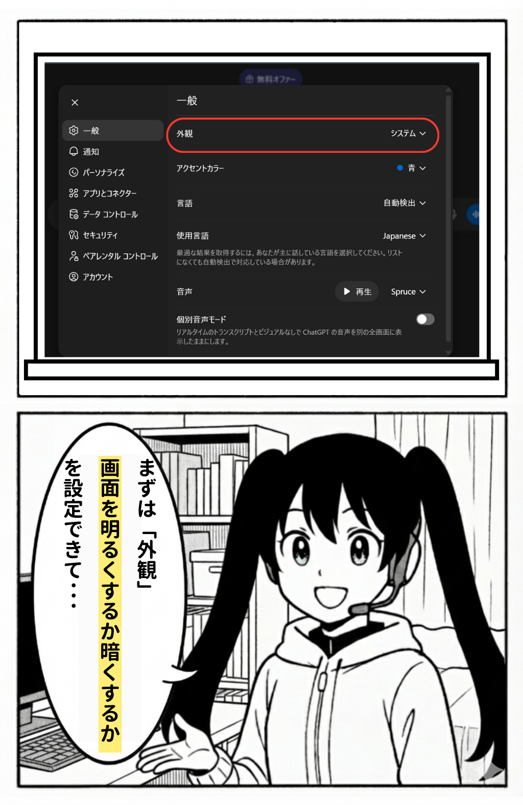 (今回の漫画で使っているChatGPTの画面は、すべてダークモードになっています。)