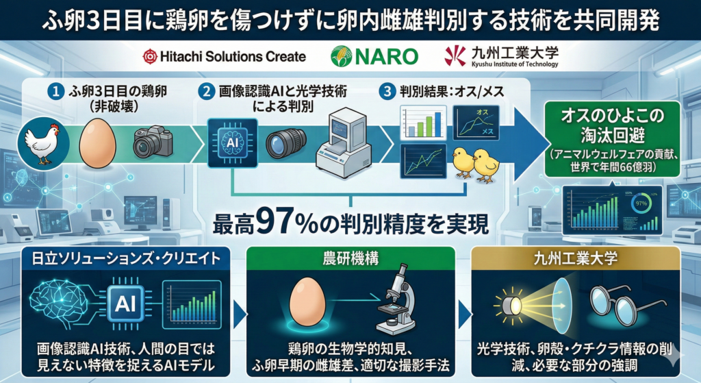 日立ソリューションズ・クリエイト、農研機構(農業・食品産業技術総合研究機構)、九州工業大学の3者は、画像認識AIを活用し、ふ卵(孵卵)3日目の鶏卵を傷つけることなく最高97%の精度で雌雄を判別できる技術を共同開発した。