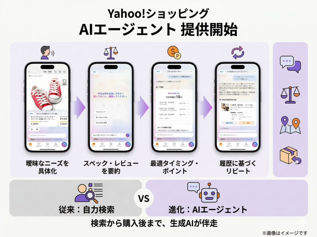 LINEヤフーが運営する「Yahoo!ショッピング」が、商品選びから購入後のフォローまで買い物のあらゆる場面を生成AIが支援する新機能「Yahoo!ショッピング エージェント」の提供を開始した。